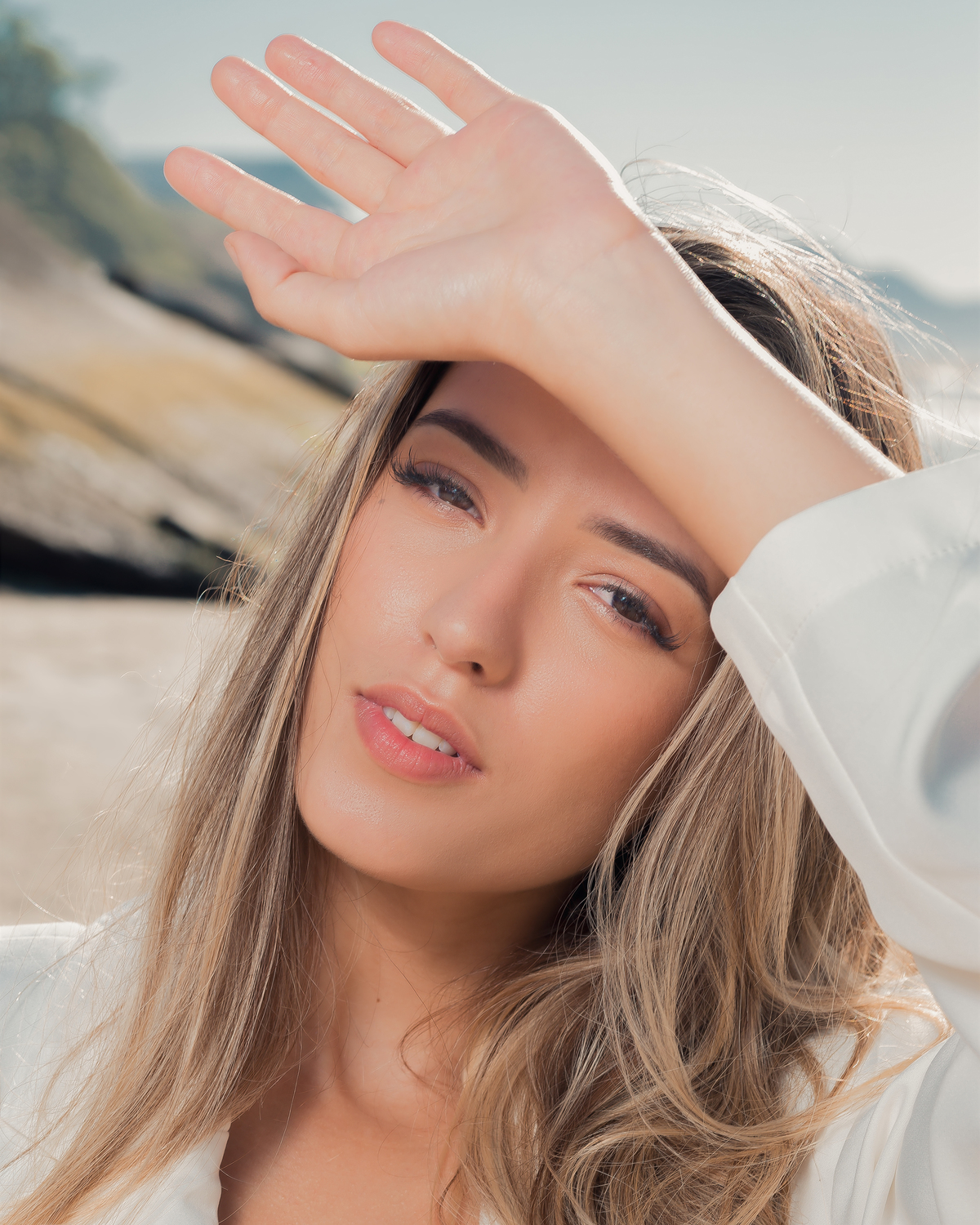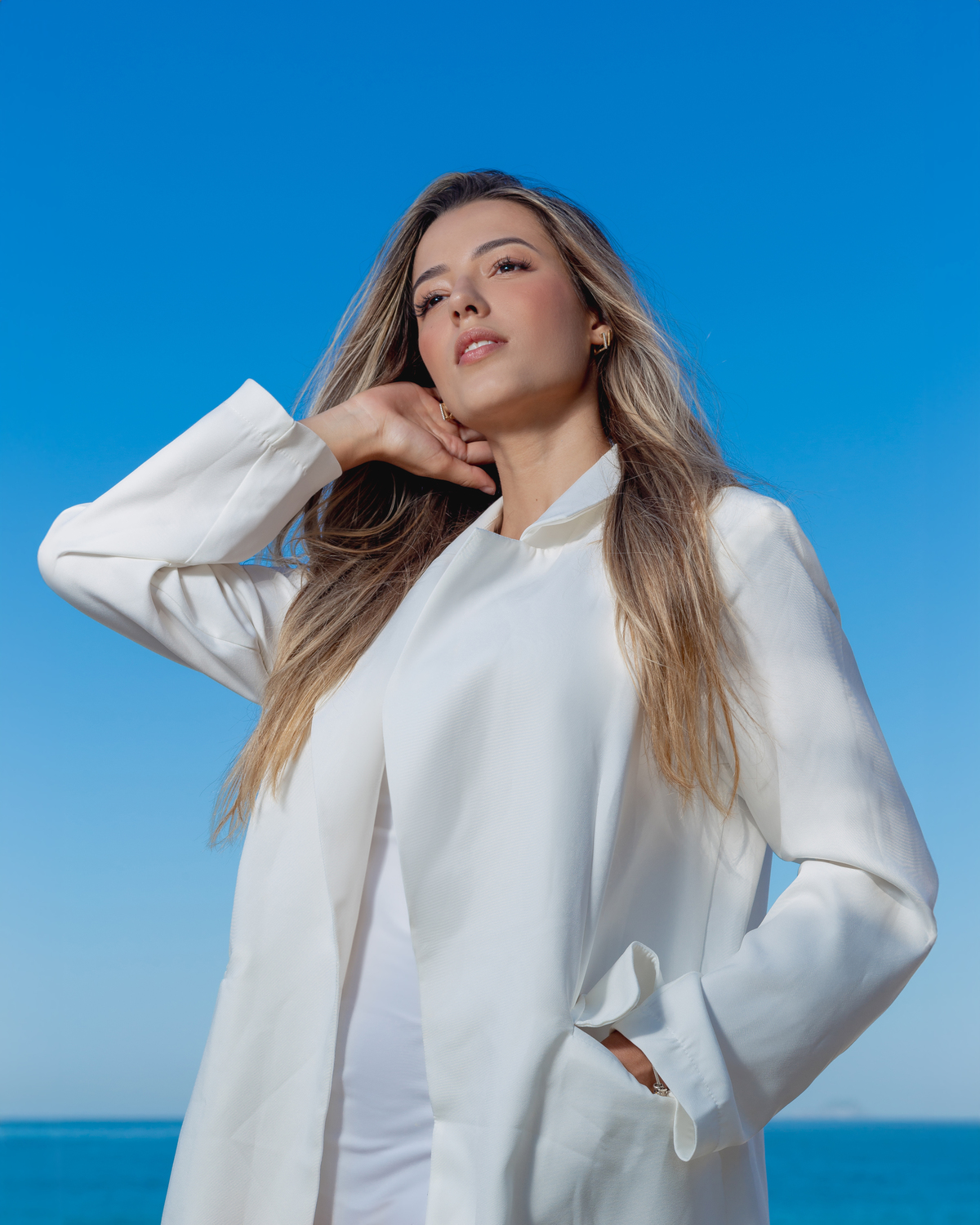A locação foi escolhida com intenção: a praia do Arpoador, no Rio de Janeiro, trouxe a fluidez, a luz e a liberdade necessárias para expressar sua essência em movimento.